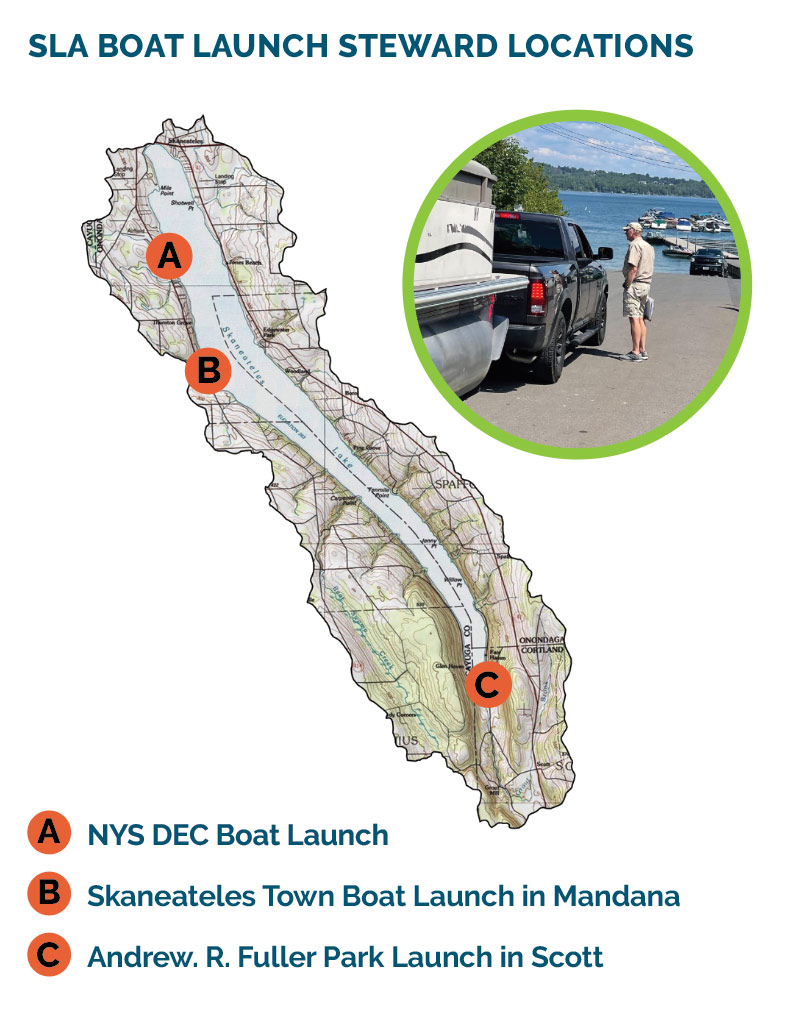 Prevent the spread of invasives with the help of SLA’s Boat Launch Stewards. Stationed at the lake’s public launch sites, the stewards inspect boats and trailers for invasive vegetation, mussels, fish eggs, and other non-native threats.Â